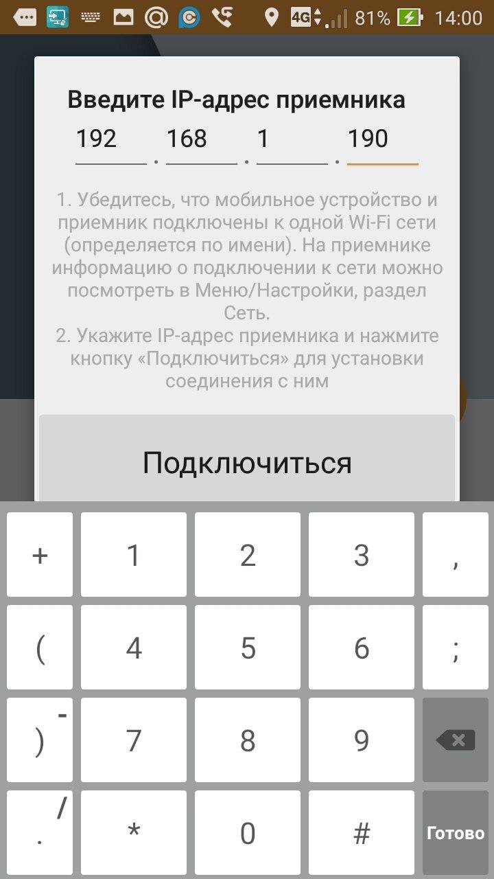 Если приставка не определилась автоматически, то можно ввести ее IP адрес вручную нажав оранжевую кнопку IP. В появившемся окне вводим адрес ресивера и нажимаем ПОДКЛЮЧИТЬСЯ.